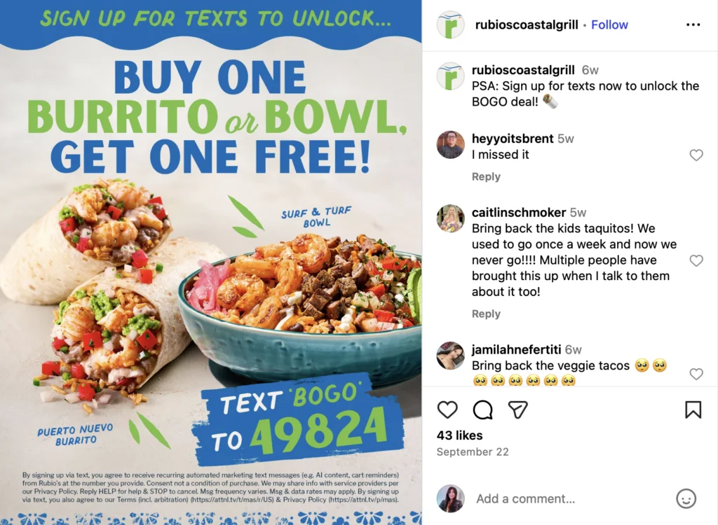 If SMS isn’t your first marketing channel and you have an email list or social media following, coordinate your content among all of your channels. In other words, make sure your texts complement your emails and social media posts.