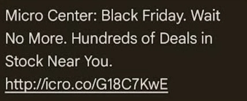 Before we dig into what goes into a BFCM SMS campaign, let’s see what one looks like. Here are BFCM messages from three companies that take different approaches to marketing.