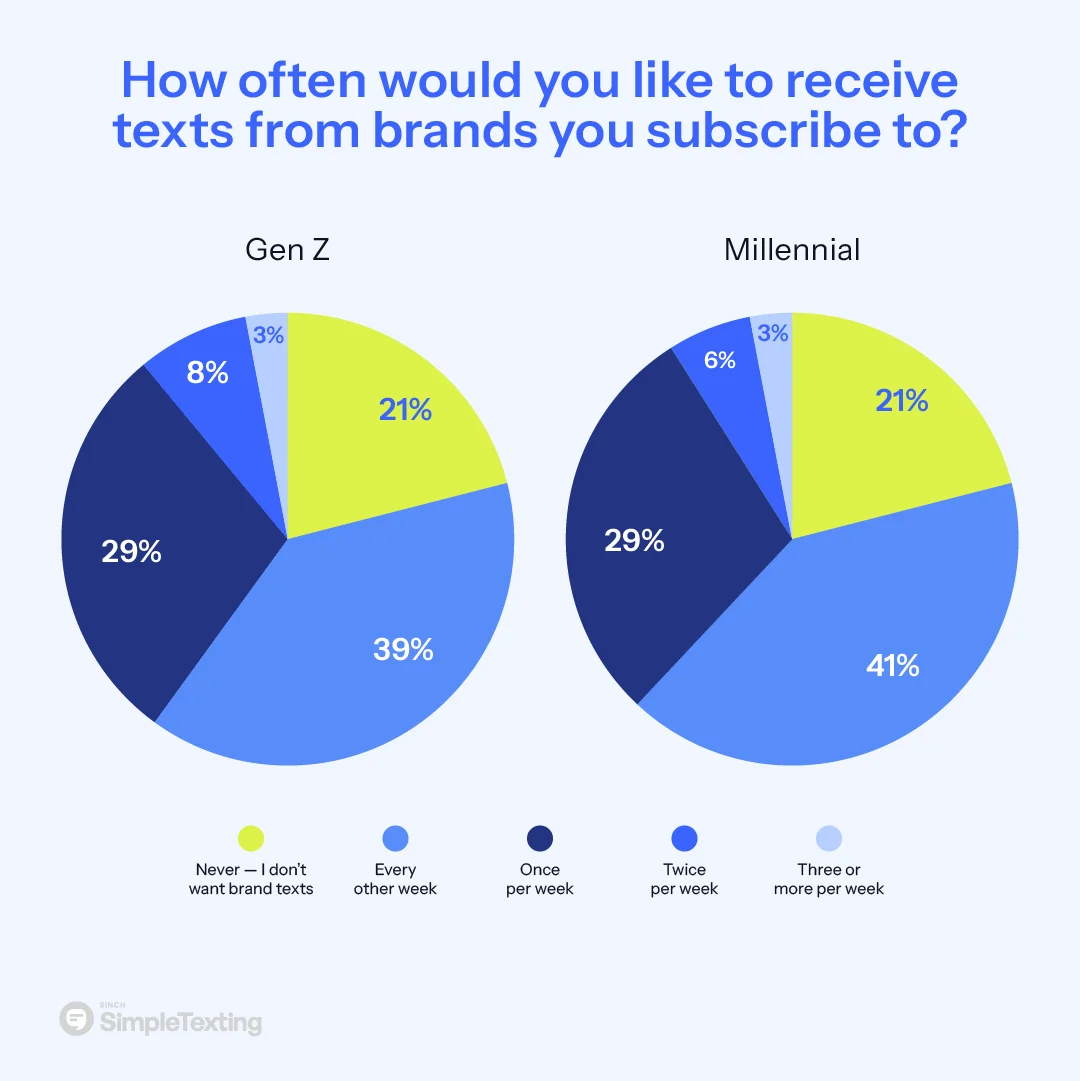 The data provides a clear answer. An overwhelming 90% of consumers want to receive texts from a brand once per week or less.